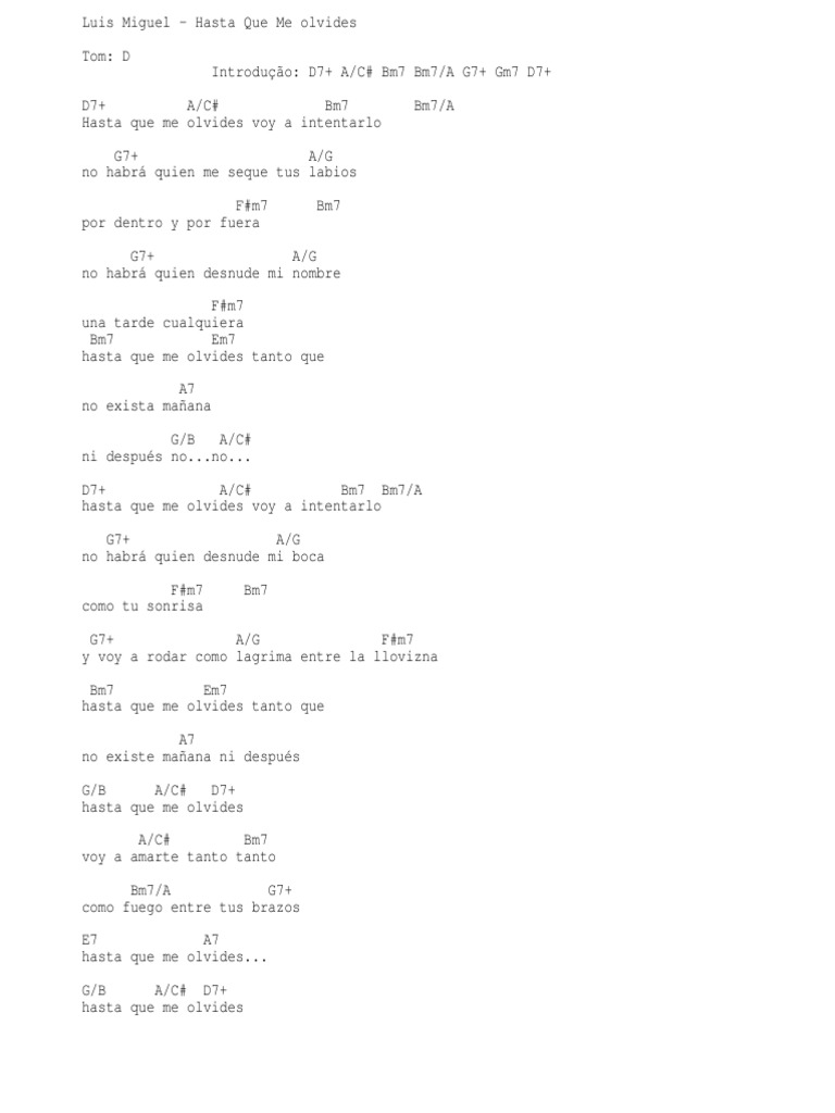 G d hasta que me olvides. Hasta que me olvides voy a intentarlo no habrá quien me seque tus labios por dentro y por fuera no habrá quien desnude mi nombre una tarde cualquiera esta hermosa canción del legendario luis miguel titulada hasta que me olvides, fue una de las canciones de mayor éxito que el cantante. On the compilation album grandes éxitos (2005). Tu cuerpo sobre la pared. On the live album el concierto (1995).